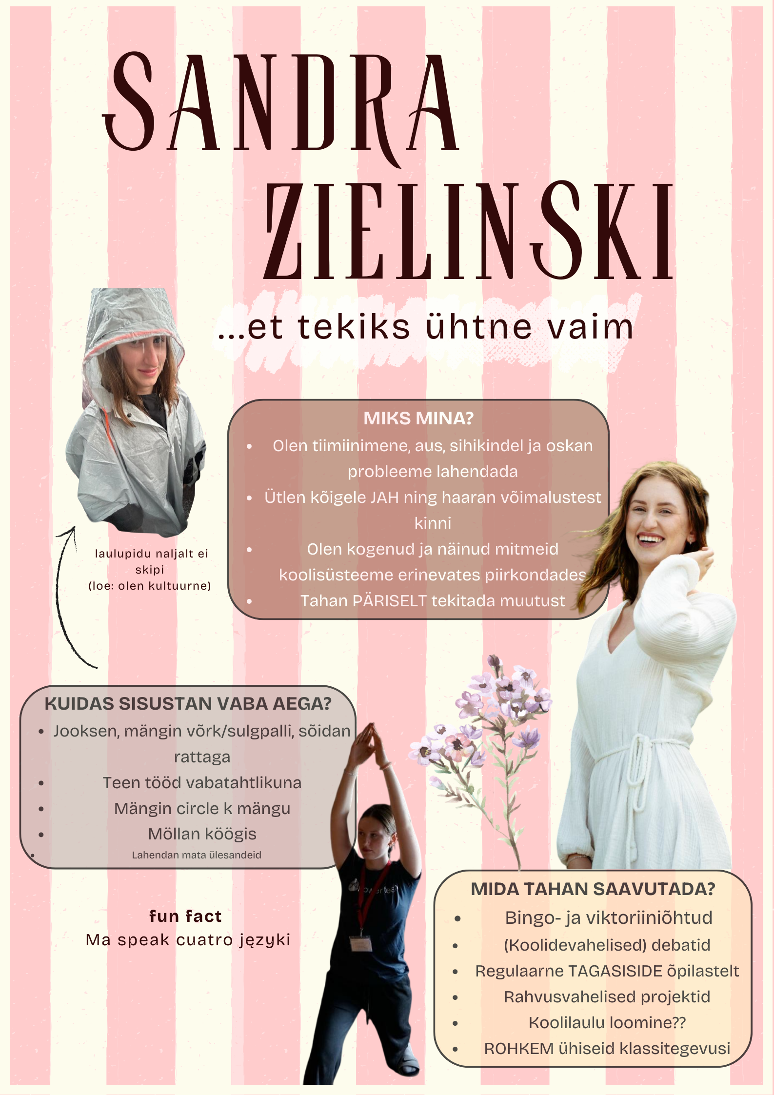 "Olen aus, sihikindel, hea loogilise mõtlemisega ja räägin nelja keelt. Ma oskan muutustega kaasa minna. Hobidest on mul väljapaistvamateks võrkpall, sulgpall, jooksmine, küpsetamine, matemaatika ja vahepeal ka meisterdamine! Olen alati avatud uutele väljakutsetele ja mulle meeldib proovida ka seni tundmatuid asju :) Kõige enam huvitaks mind õpilasesinduses ürituste korraldamine ja koostöö, ka suhtlus teiste koolidega, seal hulgas välisriikidest. Valisin enda üheks valikaineks rahvusvahelise kommunikatsiooni ning usun, et see aitab minu tööle ÕE-s kaasa. Pean oluliseks küsida õpilastelt regulaarset tagasisidet, et saaks jooksvalt vajadusel muutusi teha. Olen mõelnud koolilaulu loomisele, mis oleks hea võimalus siduda õpetajaid, õpilasi, klasse ning samaaegselt luua koolile uusi traditsioone. Neid ideid on veel palju, aga üleüldiselt tahan luua rohkem klassidevahelisi tegevusi."