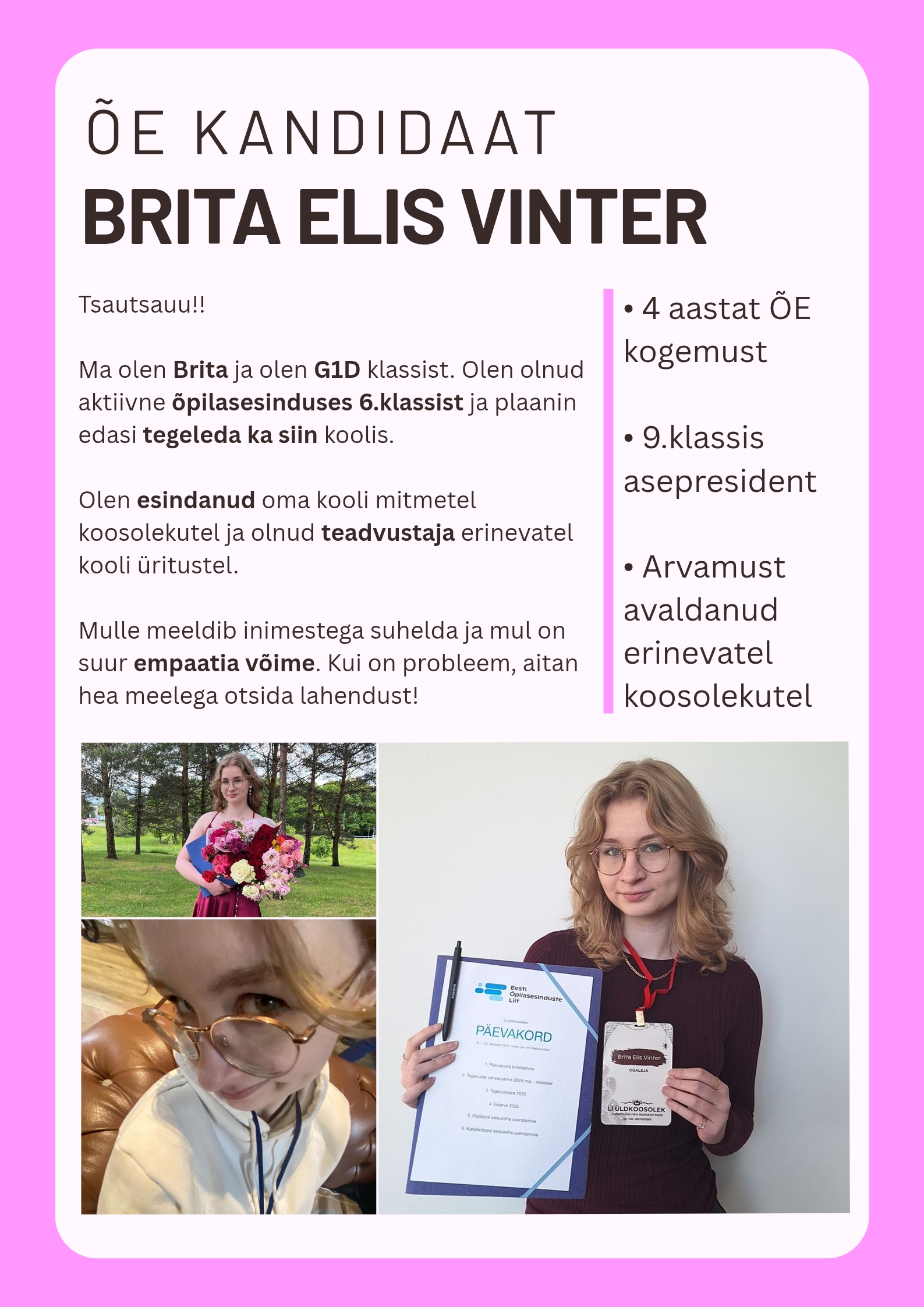 Olen olnud 6. klassist alates õpilasesinduses ja 9.klassis sain Kohila Gümnaasiumi ÕE asepresidendiks. Olen korduvalt esindanud kooli EÕEL (Eesti Õpilasesinduste Liit) üldkoosolekutel, ÕE liikmena õppenõukogus ja teadvustajana erinevatel kooli üritustel. Mulle meeldib väga inimestega suhelda ja teha koostööd grupis. Minu meelisaladeks on kunst ja meedia. Vabal ajal teen meelsasti käsitööd ja meisterdan palju. Mul on häid mõtteid mida postitada sotsiaalmeediasse, kuigi ma ei ole veel kõige osavam postituste tegemisel. Aitan heameelega korraldada/kaunistada. Olen usaldusväärne tiimi liige.