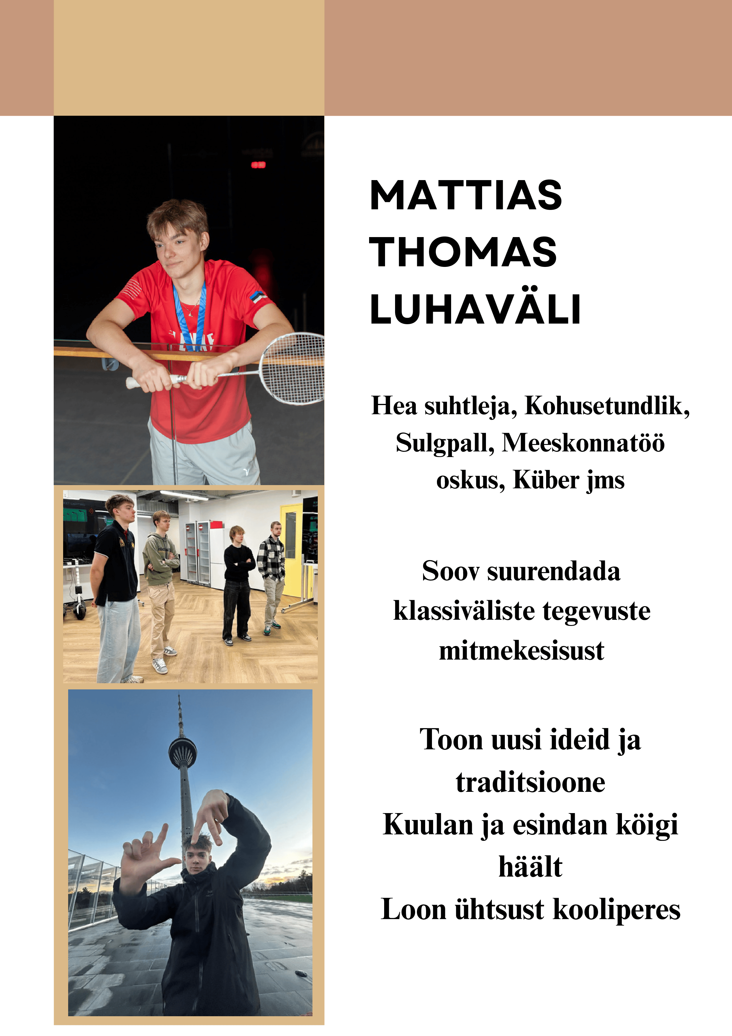 Olen hea suhtleja, kohusetundlik. Leian, et mul on hea meeskonnatöö oskus. Hobideks on sulgpall, küber jms. tehniline, IT. Soovin ÕE-s suurendada klassiväliste tegevuste mitmekesisust. Tahan kaasa rääkida koolipäeva ja õppimise targema korralduse nimel – näiteks rohkem vahetundide sisustamist, koolihoone veel mugavamaks muutmine ja teisi õppimist toetavaid muudatusi. Oluline on luua ühtsustunnet – et õpilased tunneksid, et nad on osa koolipere tervikust.